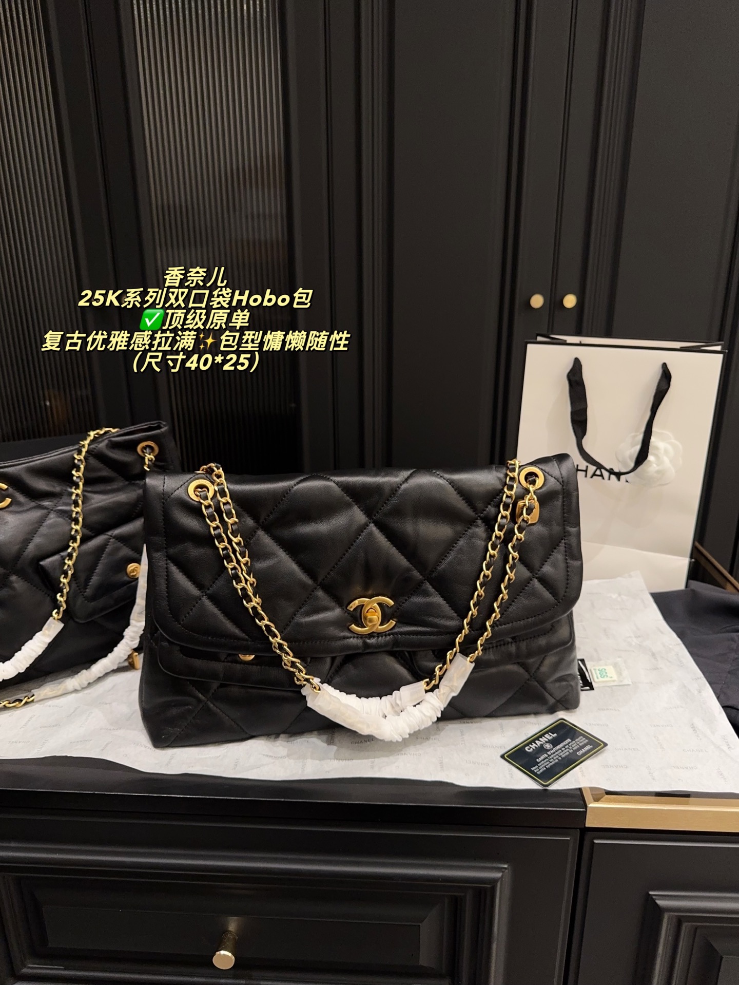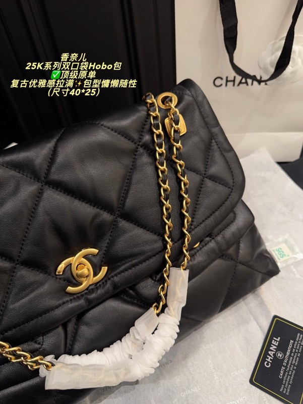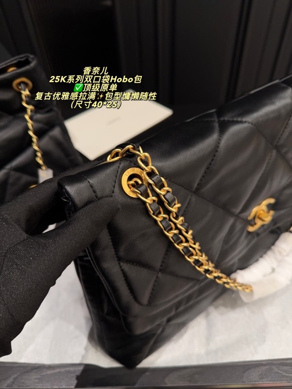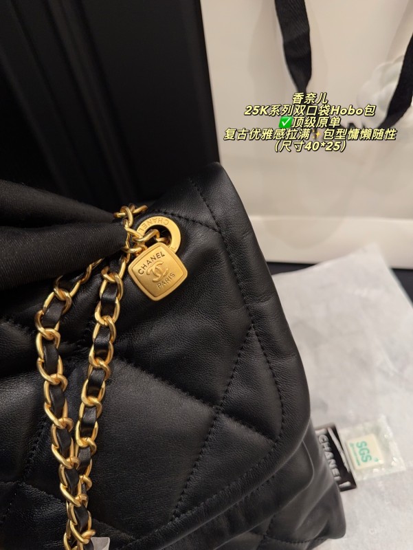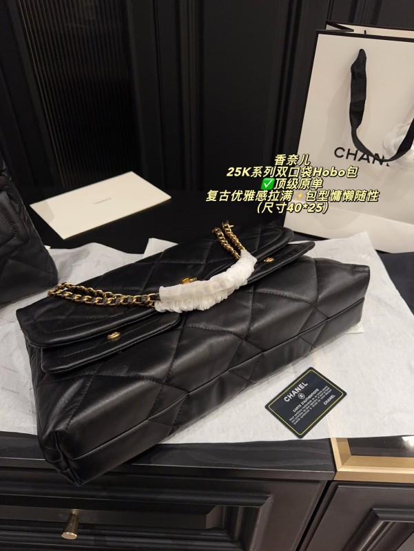✅ Top-quality original single made in China, size 40*25 chanel 25K series double pocket Hobo bag, black goatskin + classic diamond pattern, soft and delicate touch, paired with golden double C Logo and chain, retro and elegant to the fullest ✨. The bag is laid-back and casual, with a large capacity, making it suitable for both commuting and leisure. The front and rear pocket designs are both practical and fashionable. The chain can be carried by hand or on the shoulder, offering flexibility and versatility. Goatskin is of high quality, with a smooth touch and becomes more lustrous with use. It is a fashionable item that combines practicality and collectibility