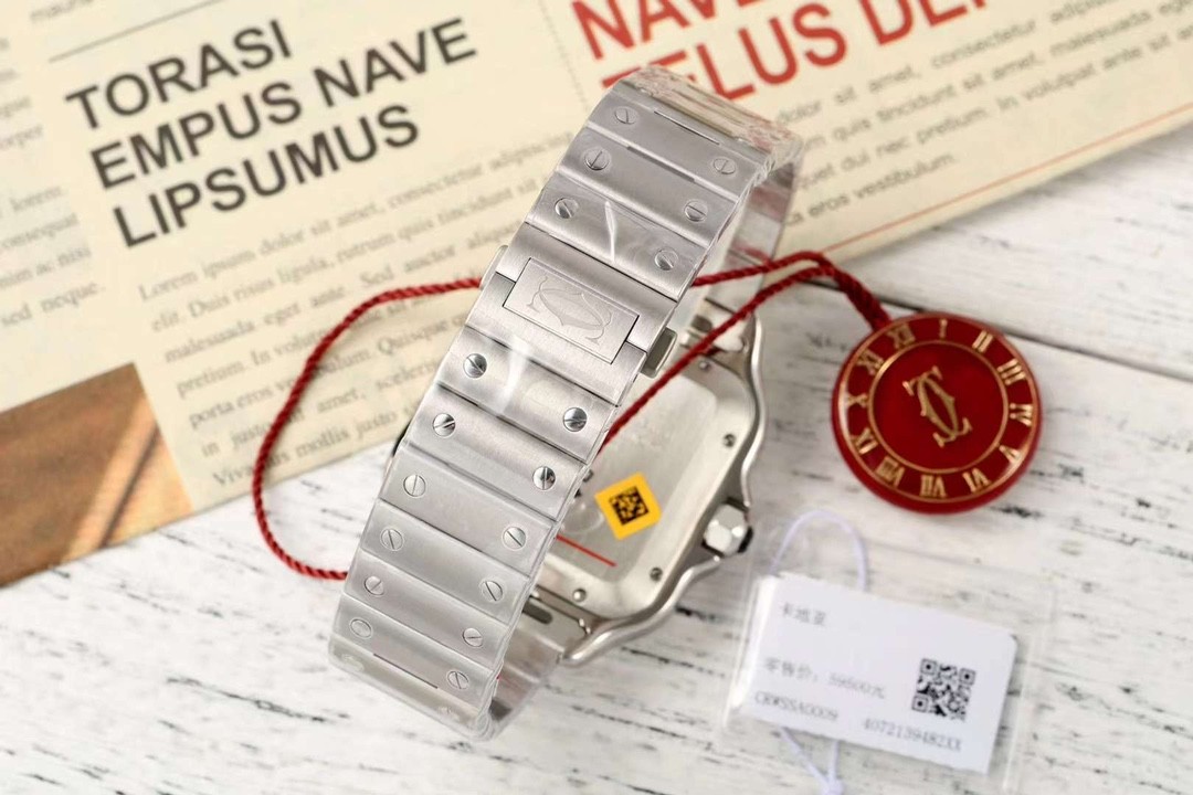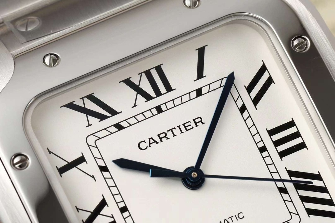 The AF Cartier Santos watch, a model of mature charm. [Case] Measuring 47.5X39.8MM, it features a stainless steel case that continues the classic square design. The sharp straight lines replace the smooth ones, breaking the tradition of round dials. The spirit of never compromising and striving for perfection contained within. The wire drawing process Outlines bold lines. Round crown, set with a cabochon blue synthetic spinel. [Dial] Silver-plated matte dial, sunray pattern effect, Roman numeral hour markers, sword-shaped blue steel hands, sapphire crystal, and a unique design with 8 rivets on the outer ring. 【 Movement 】 It features an automatic mechanical movement that rivals the original, with an extremely long battery life. 【 Strap 】 The rivet quick-release bracelet is truly unique. It is available in both leather and steel strap options, and you can switch to a crocodile leather strap of a different color according to your preference, which can also meet different needs in terms of matching. AF Santos carries the legend of ceaseless exploration and never-ending dreams.