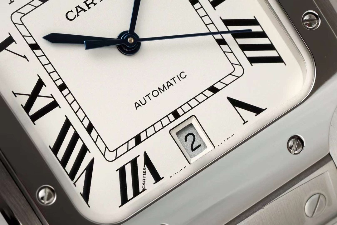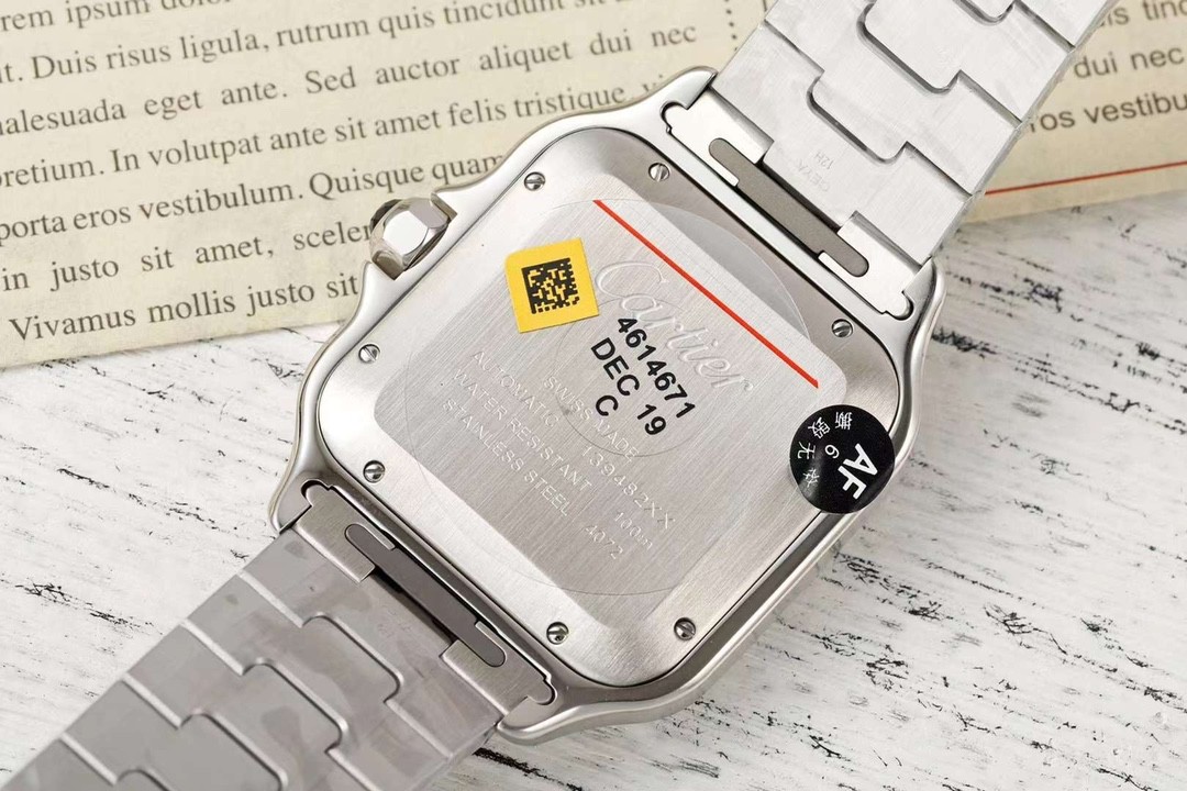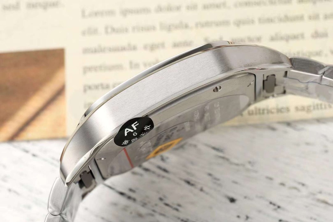 The AF Cartier Santos watch, a model of mature charm. [Case] Measuring 47.5X39.8MM, it features a stainless steel case that continues the classic square design. The sharp straight lines replace the smooth ones, breaking the tradition of round dials. The spirit of never compromising and striving for perfection contained within. The wire drawing process Outlines bold lines. Round crown, set with a cabochon blue synthetic spinel. [Dial] Silver-plated matte dial, sunray pattern effect, Roman numeral hour markers, sword-shaped blue steel hands, sapphire crystal, and a unique design with 8 rivets on the outer ring. 【 Movement 】 It features an automatic mechanical movement that rivals the original, with an extremely long battery life. 【 Strap 】 The rivet quick-release bracelet is truly unique. It is available in both leather and steel strap options, and you can switch to a crocodile leather strap of a different color according to your preference, which can also meet different needs in terms of matching. AF Santos carries the legend of ceaseless exploration and never-ending dreams.